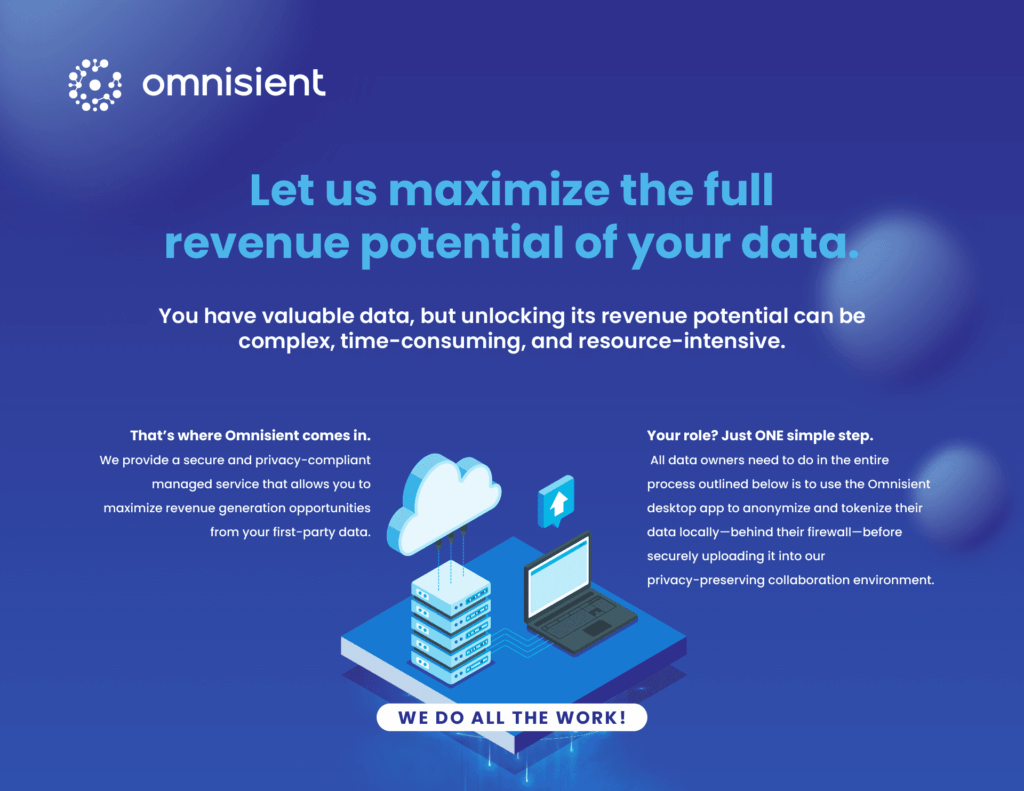 View our infographic on easy, secure, and compliant Data Monetization for 1st party consumer data owners. Just anonymize and upload your data – we do the rest!